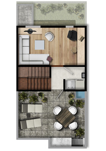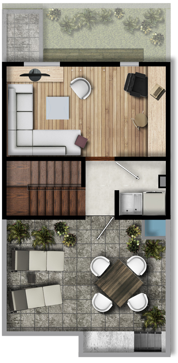 119.2 m2 + 19.35 m2, 2 recámaras, sala, comedor, 2.5 baños, cocina abierta, cuarto de TV y estudio, Roof Garden, jardín y estacionamiento.
