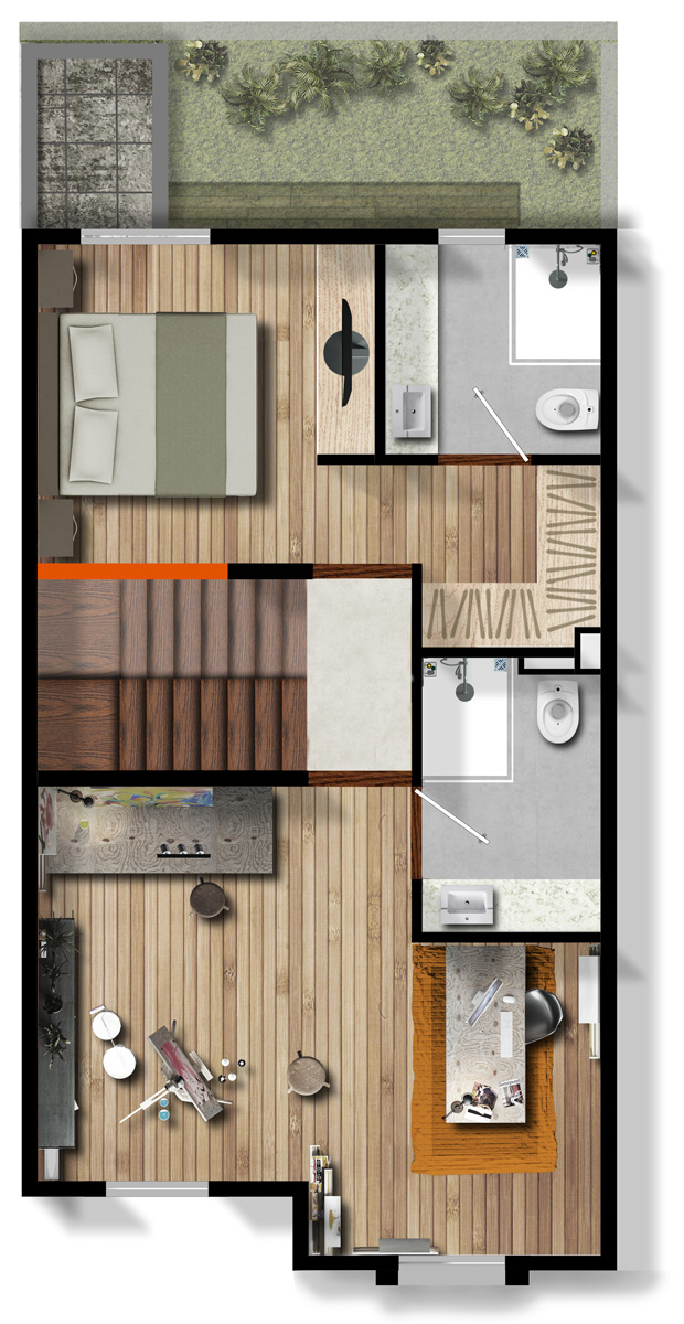 119.2 m2, 1 recámara, sala, comedor, 1 estudio, 2.5 baños, cocina abierta, Roof Garden, jardín y estacionamiento.