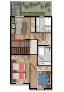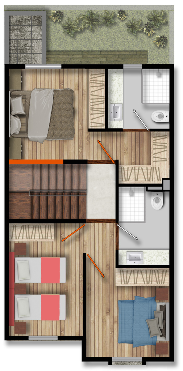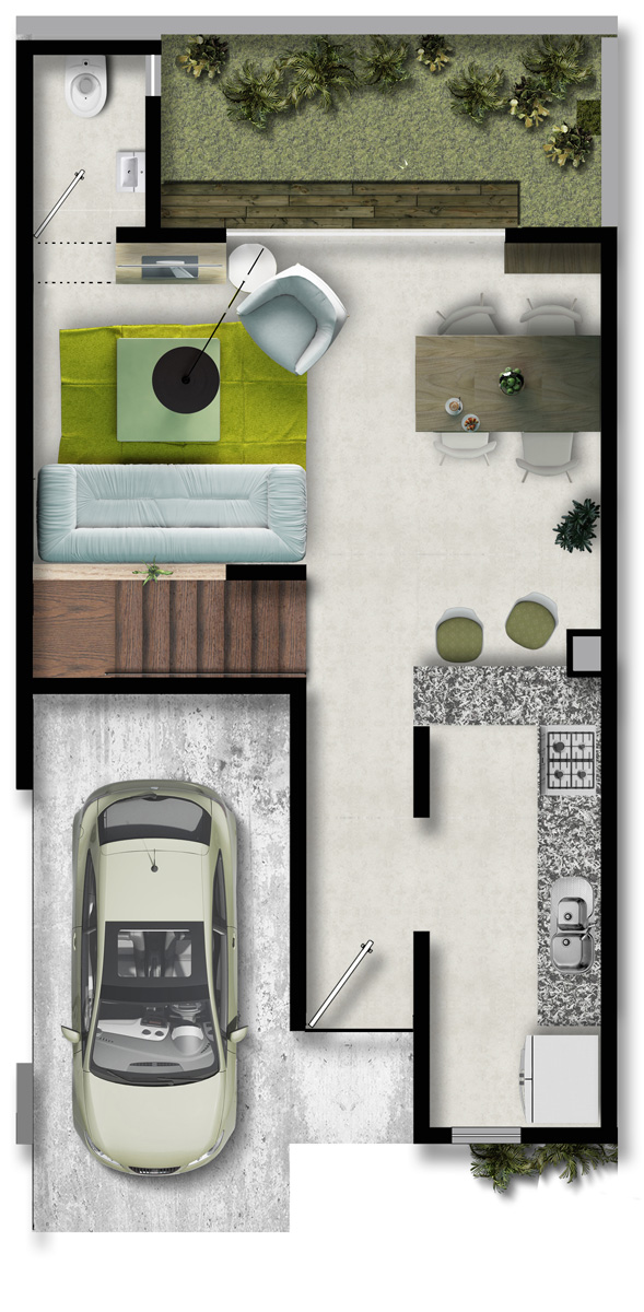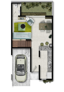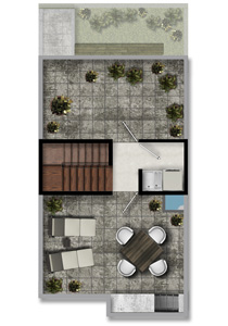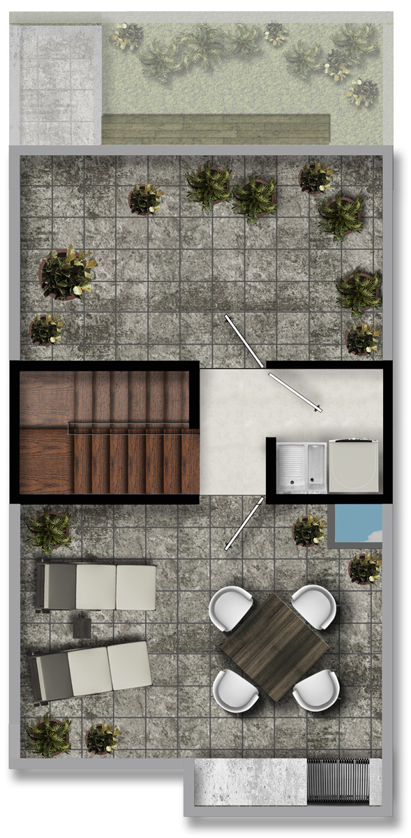 119.2 m2, 2 recámaras, sala con tv, comedor, cocina abierta, 2.5 baños, Roof Garden, jardín y estacionamiento.